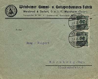 Inland cover (1-20 g) from 03.11.1923 franked with 2 stamps a 50 Million Mark (=100 Million Mark) |