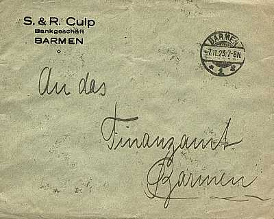 Ortsbrief (1-20 g) vom 05.11.1923 frankiert mit 50 Marken a 10 Millionen Mark(=500 Millionen Mark)