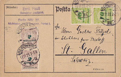 Auslandspostkarte vom 17.11.1923 frankiert mit 4 Marken (=24 Milliarden Mark)