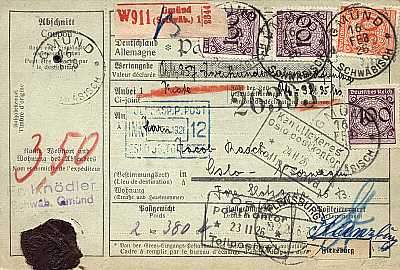 Foreign parcel card with value (257 Mark) (2 380 g) from 16.02.1926 franked with 4 stamps (=3,50 Mark)