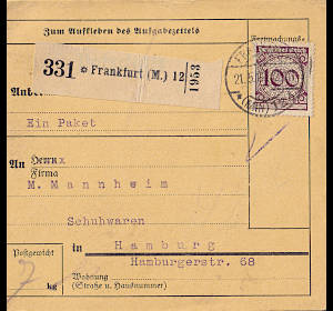 Inland parcel card (7 000 g, 75-375 km) from 21.05.1924 franked with one stamp a 100 Pfennig (=1 Mark)