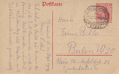 Inlandspostkarte vom 25.09.1919 (3. Periode) frankiert mit einem Wertstempel a 10 Pfennig (=10 Pfennig) |