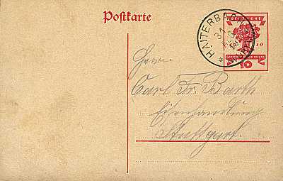 Inland postcard from 31.08.1919 (3. Period) franked with one stamp impression a 10 Pfennig (=10 Pfennig)