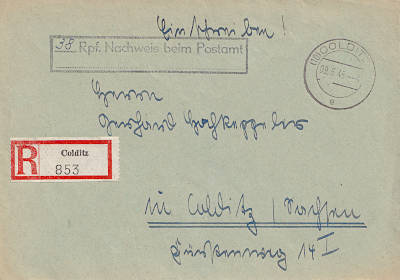 Colditz: Ortsbrief mit Einschreiben (1-20 g) vom 09.06.1945 mit schwarzem Rechteck-stempel (z) "Rpf. Nachweis beim Postamt" und handschriftliche Gebührenhöhe "38"