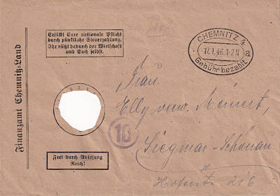 Chemnitz 4: Inlandsbrief (1-20 g) vom 17.01.1946 mit schwarzem Zweiellipsensteg-stempel (bozbo) "CHEMNITZ 4/ (Datum) a/ Gebühr/ bezahlt"