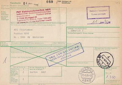 Stuttgart 61: Auslandspaketkarte (1 350 g) vom 29.05.1985 mit violettem Rechteck-stempel mit Zeile (3z) "Gebühr bezahlt/ Taxe perçue/ DM Pf" und handschriftliche Gebührenhöhe "11 30" |