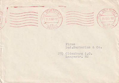 Stuttgart 9: Inlandsbrief (1-20 g) vom 11.03.1960 mit rotem Zweikreisstegstempel (boz2bu) "(14a) STUTTGART 9/ (Datum)/ pp/ Bezahlt" |