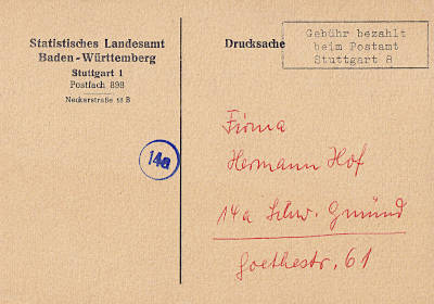 Stuttgart 8: Inlandsdrucksache (1-20 g) vom 05.01.1960 mit schwarzem Rechteckstempel (3z) "Gebühr bezahlt/ beim Postamt/ Stuttgart 8" |