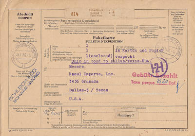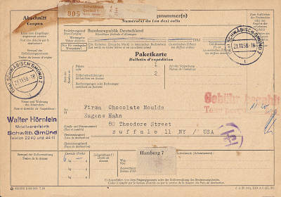 Schwäbisch Gmünd 2: Auslandspaketkarte (6 000 g) vom 21.11.1958 mit Zweizeiler (2z) "Gebühr bezahlt/ Taxe perçue Rpf." und handschriftliche Gebührenhöhe "11,20" |