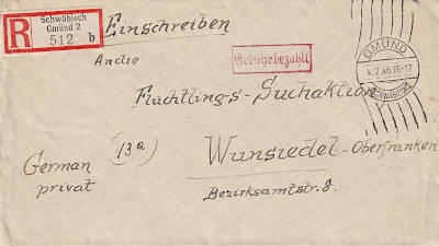 Schwäbisch Gmünd 2: Inlandsbrief mit Einschreiben (1-20 g) vom 04.02.1946 mit rotem Rechteckstempel (z) "Gebühr bezahlt" |