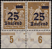 Aufdruck-Hausauftragsnummer: fortlaufende Auftragsnummer auf einem Bogenrand bei einer Briefmarke mit Aufdruck der sich auf den Aufdruck bezieht |