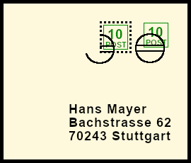 falsche Frankatur: betrĂ¼gerische Nachahmung einer Frankatur mit echten gestempelten Briefmarken aber falscher Zusammenstellung |