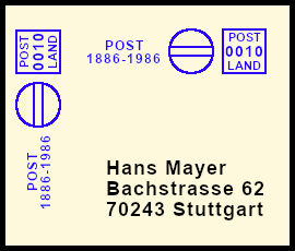 farbübersättigter Freistempel: Postsendung die durch einen Fehler mit einem unsauberen Freistempel versehen wurde hervorgerufen durch zu viel Farbe auf der Druckplatte |