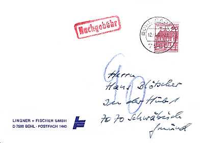 Nachsendungsfrankatur: Postsendung mit 2 Frankaturen die zweimal durch die Post befördert wurde, z. B. wenn diese durch eine Privatperson dem eigentlichen Empfänger nachgesandt wurde |