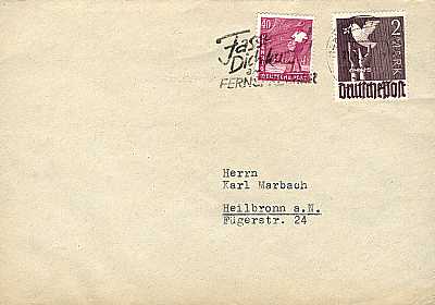 Zehnfachfrankatur: Postsendung aus Deutschland bei der die Briefmarke zu einem Zehntel ihres Nennwert verwendet wurde (z. B. Brief 24 Pfennig) |
