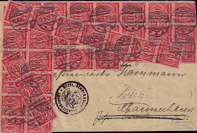 Massenfrankatur: Postsendung frankiert mit einer Vielzahl von Briefmarken infolge Fehlens geeigneter hoher Wertstufen oder als philatelistische Spielerei |