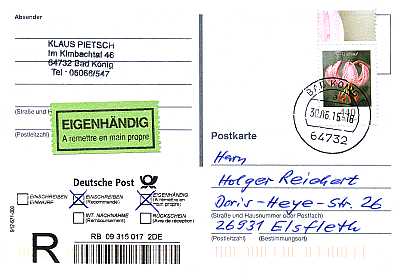 Postkarte mit Übergabe-Einschreiben und eigenhändiger Zustellung |