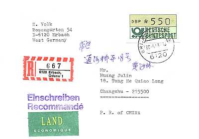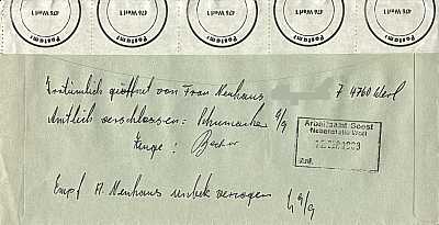 Absenderfreimachungsvermerk: Vermerk auf einer von einem Absender frankiert ein-gelieferten Postsendungen bei der die Über-frankatur nicht von der Post zu verantworten ist (5 DM anstatt 4 DM) |