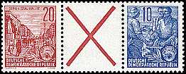 Zusammendruck Briefmarkenbilddruck mit Kreuz: Einheit bei der als beabsichtigte Ausführung ein Bogenfeld mit einem Brief-markenbilddruck und das andere mit einem Andreaskreuz bedruckt wurde |