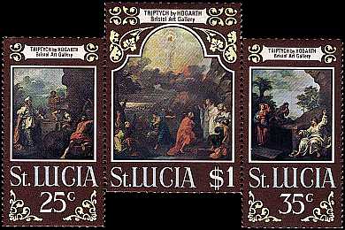 Triptychonzusammendruck: Einheit bei der als beabsichtigte Ausführung die mittlere Briefmarke nach oben versetzt ist (griechisch = dreiteiliger Altaraufsatz) |