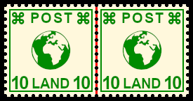 falscher Zusammendruck mit entfernter Zähnung zwischen den Briefmarken: zwei einzelne echte Briefmarken bei denen in betrügerischer Absicht die Zähnung teilweise abgeschnitten wurde um sie dann miteinander zu verbinden |